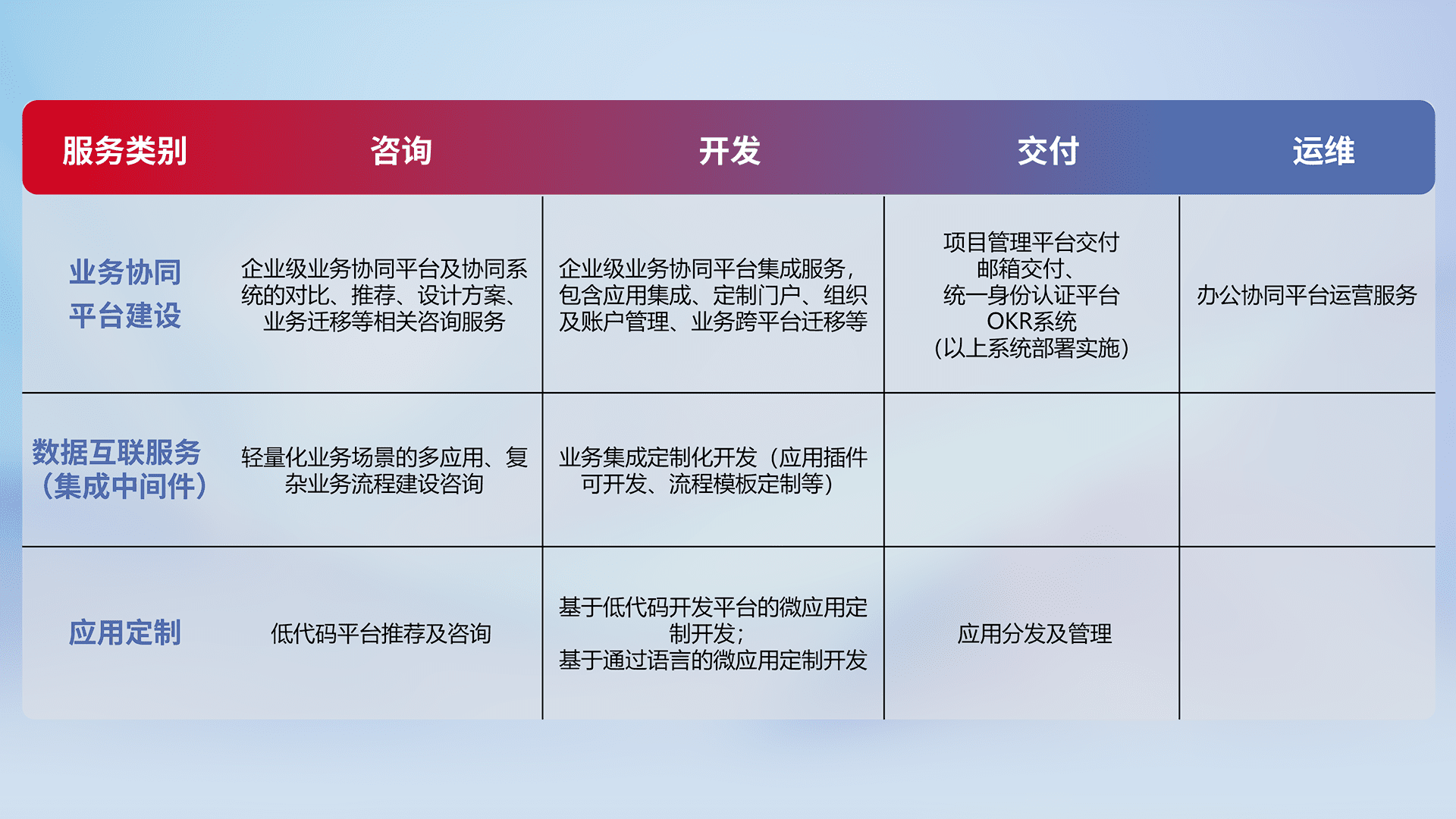 针对钉钉、、企微、、、、IDaas等平台级产品提供产品的规划、、、、方案、、交付、、、、定制化开发等服务,,,,实现如统一协同办公、、、、智能客户服务、、混合会议管理、、智能数据查询、、、、等业务场景,,实现数字化转型。。。。