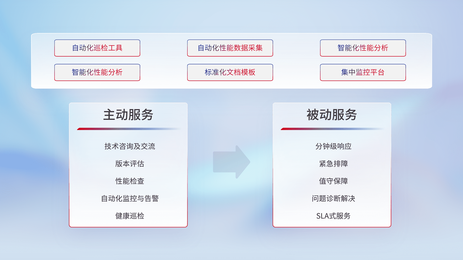 智能化工具和标准化文档,,,,保障服务质量,,提供主动服务(包含技术咨询、、、版本评估、、性能检查、、、、自动化监控与告警、、、、健康巡检)和被动服务包含(分钟级响应、、、、紧急排障、、、、值守保障、、、、问题诊断解决、、、、SLA服务)。。